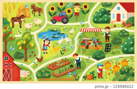 Farm map. Kids village scene. Cute garden road. Tractor and cow at field. Farmer market. Farming animal. Children growing vegetables. Town roadmap. Vector countryside farmland infographics
