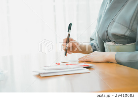 ご祝儀袋に筆ペンで表書きをするシニア女性