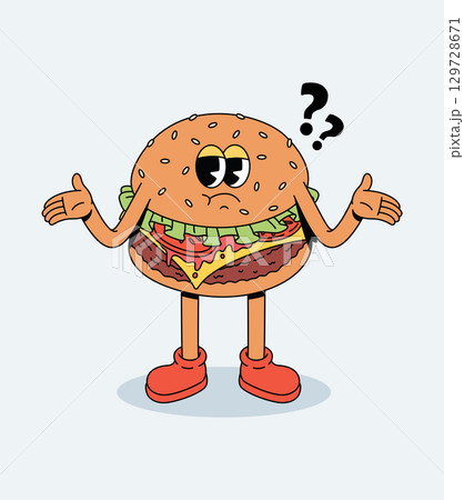 Confused Groovy Cartoon Burger Character Shrugging with Question Marks