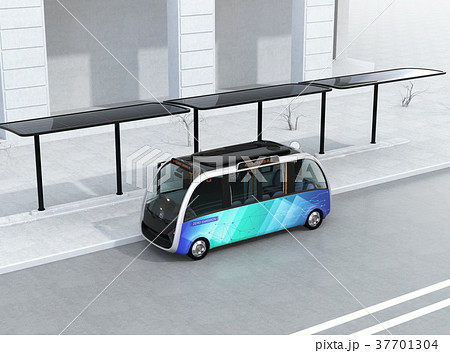 ソーラーパネルが備えているバス停に停車中の自動運転シャトルバス。省エネ交通機関のコンセプト