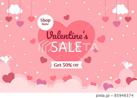 バレンタインセールのバナー、ハートの雲のイラスト、ピンク色