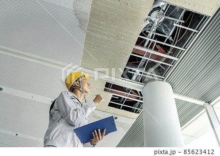 タブレットを持ってビル天井の破損箇所を調査する作業服姿の男性