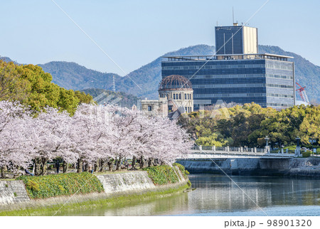 広島県広島市 春の広島 桜が満開の平和記念公園と元安川越しに見える原爆ドーム