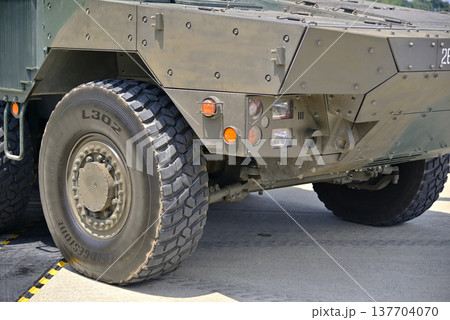 Close-up of BTR-60 armored vehicle wheels, showing massive tires, rims, and suspension elements