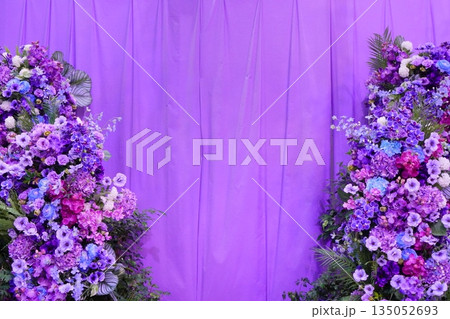 紫の花に囲まれた豪華フラワーフレーム 背景用コピースペース