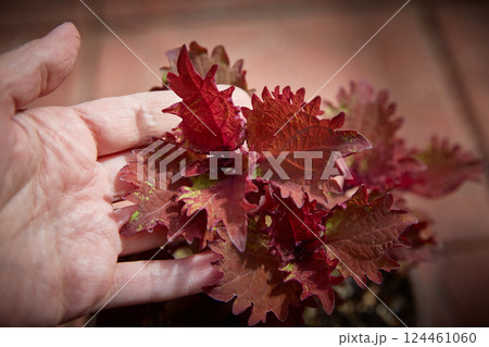 Coleus Blumei Plectranthus scutellarioides. Name of the plant variety Christmas Candy. Coleus leaves in hand close-up.