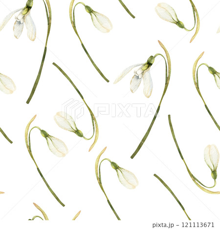 White romantic snowdrops flowers seamless pattern. Watercolor floral background with spring botanical elements for seasonal festive design, packing, wallpaper, kitchen textile design