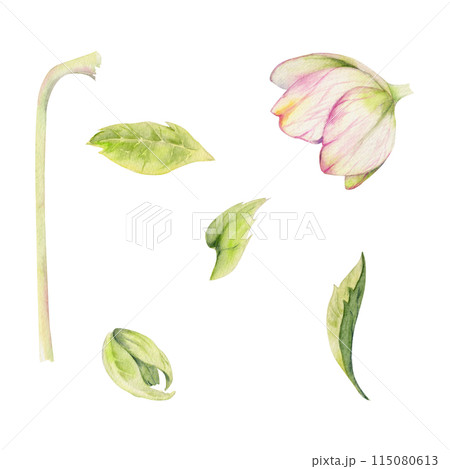 Pink hellebore, lenten rose winter flower, leaves, stem. Hand drawn watercolor botanical illustration. Single object isolated on white background. Design wedding cards, florist shop, Christmas bouquet