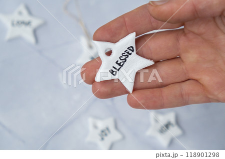 Christmas star with word BLESSED Unrecognizable artist do it yourself air dry clay crafts for Christmas tree decor holiday. Decoration gift idea Handmade children craft. Step by step instruction of