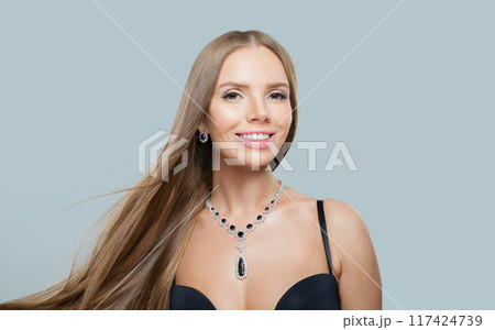 Elegant jewelry woman with long healthy hair wearing glamour jewellery necklace.