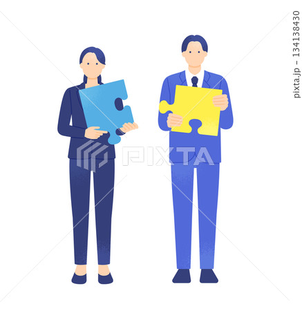 問題解決や連携のイメージ。パズルのピースを持つビジネスマンとビジネスウーマンのイラスト素材。