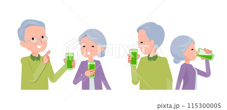 青汁を飲むシニア夫婦。談笑とリラックスしているシーン