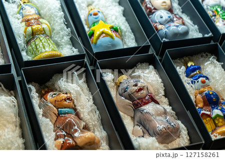 Storage of glass Christmas tree toys in a box. Christmas decorated packaging.