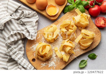 Uncooked tagliatelle pasta nests with basil, tomatoes and eggs on wooden cutting board