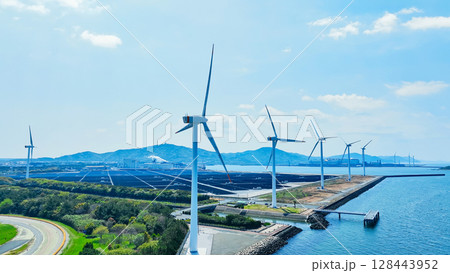 風車とソーラーパネルのハイブリッド発電所の風景空撮