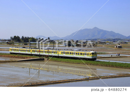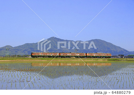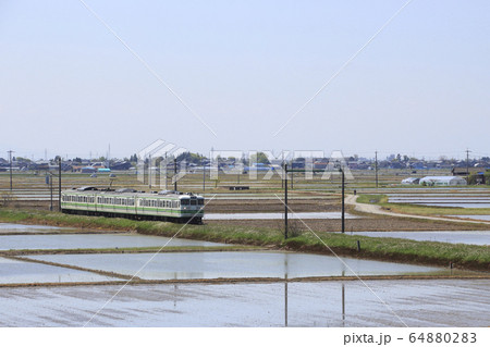 田植え準備の水田と越後線115系(懐かしの新潟色)