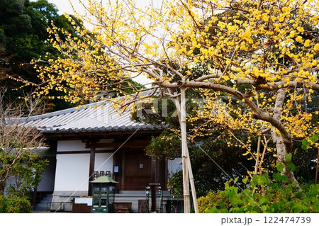 奈良県当麻寺西南院で黄色の花を満開に咲かせる蝋梅と背景の来迎院【1月】