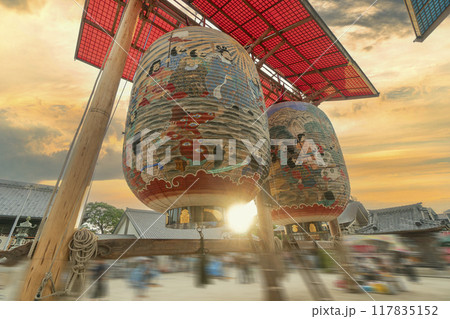 三河一色大提灯まつり、巨大な提灯に描かれた時代絵巻が浮かぶ〈愛知県西尾市〉