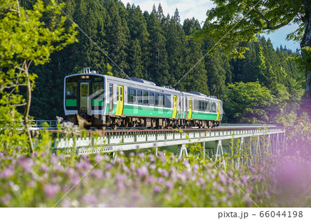 第一只見川橋梁を渡る只見線の列車 俯瞰 福島県三島町