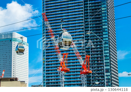 日本の横浜都市景観9月6日。桜木町駅前のロープウェイやザ・タワー横浜北仲の前に並ぶクレーンなどを望む