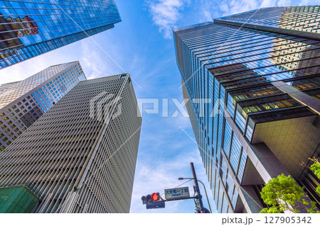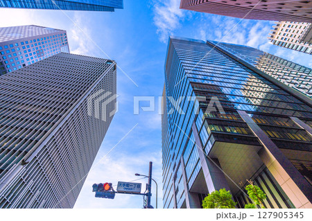 日本の東京都市景観 大手町一丁目の交差点から大手町のオフィス街などを望む=16日