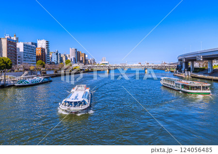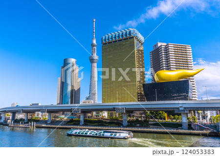 日本の東京都市景観 浅草水上バス乗船場を離れたホタルナなどを望む…=5月3日