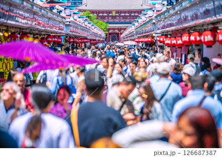 日本の東京都市景観 団体旅行客や外国人観光客らで大混雑の浅草寺…=28日