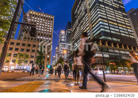 日本の東京都市景観 東京駅丸の内北口。仕事などを終えて駅に向かう人たち。奥は丸の内のオフィスビル群