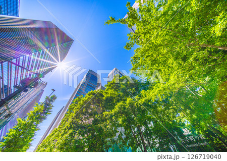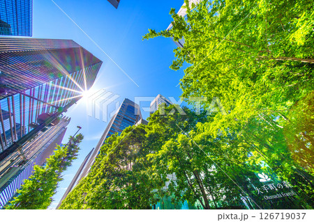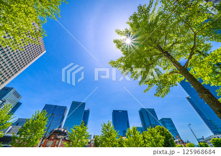 日本の東京都市景観 大手町の森などを望む。新緑に映えるビジネス街…新たな時代に向かって…=28日