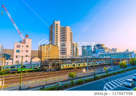 日本の藤沢都市景観 7月。東海道本線 辻堂駅や電車・オレンジ色と緑ラインの湘南色などを望む=21日
