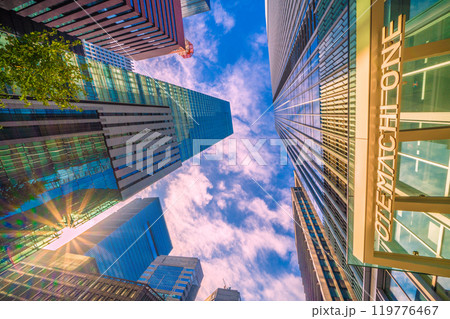 日本の東京都市景観 年の瀬。大手町の摩天楼。低い太陽光が柔らかな光でオフィスビル群を包み込む=22日
