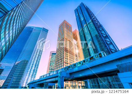 日本の東京都市景観 年の瀬。汐留のオフィスビル群やゆりかもめなどを望む。栄光の時代へ=26日