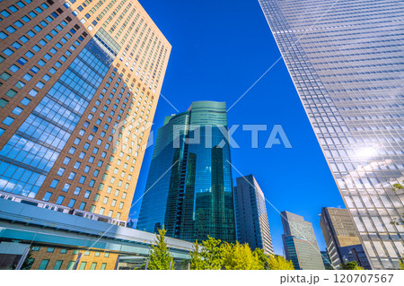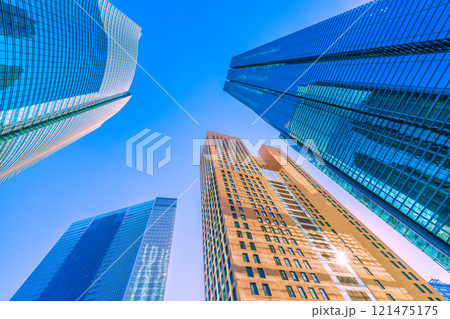 日本の東京都市景観 年の瀬。反射する太陽光…汐留のオフィスビル群などを望む。新時代に向かって=26日
