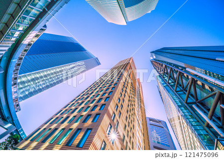 日本の東京都市景観 朝の日差しを浴びる汐留のオフィスビル群がガラス窓に浮かび上がる…希望の光=9日