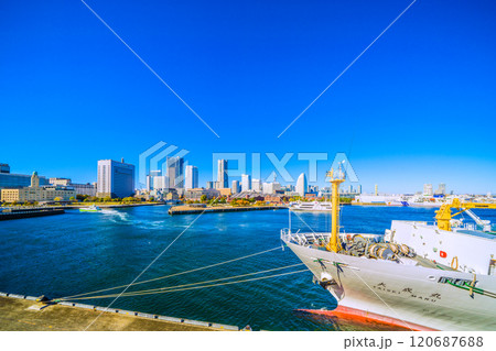 日本の横浜都市景観 横浜大さん橋に接岸した航海練習船「大成丸」やみなとみらいの街などを望む=28日