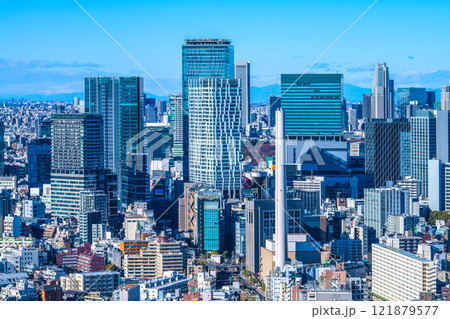 日本の東京都市景観 渋谷のオフィスビル群。渋谷アクシュも完成。山手線や成田エクスプレスなどを望む