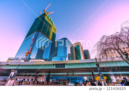 日本の東京都市景観 年の瀬。東京駅日本橋口側から日本橋一丁目の再開発事業や常盤橋タワーなどを望む