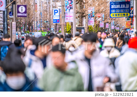 日本の東京都市景観 2月。アジア系団体観光客の一行。コロナ禍前と変わらない賑わい…XEC株に=秋葉原