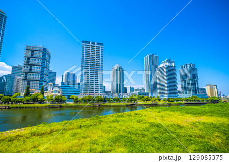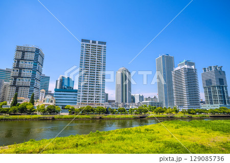 日本の横浜都市景観 横浜・リバーサイドのタワーマンション群などを望む