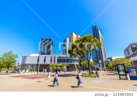 日本の横浜都市景観 桜木町駅新南口から桜木町駅前複合ビル・JR東日本ホテルメッツ横浜桜木町などを望む