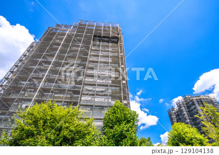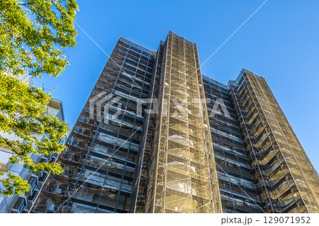 日本の横浜都市景観 マンションの補修や点検等、足場や防護ネットなどを望む…