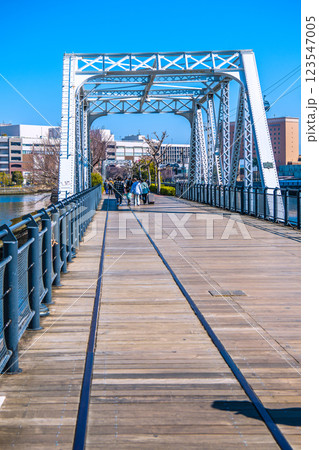 日本の横浜都市景観 4月並みの陽気…観光客らで賑わう汽車道。奥に運河パーク駅=1日