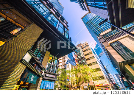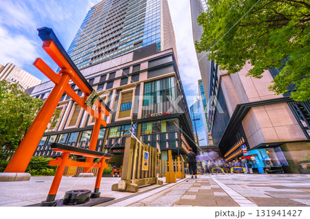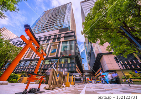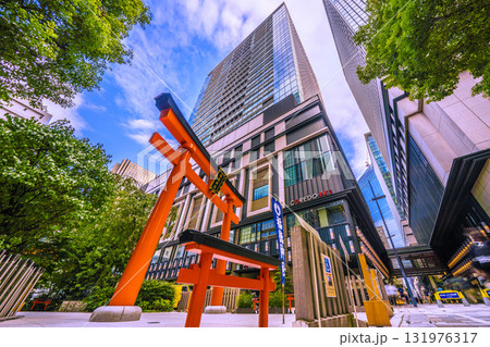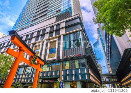 日本の東京都市景観 日本橋室町・ビルの谷間の福徳神社などを望む。右奥に再開発のビル…