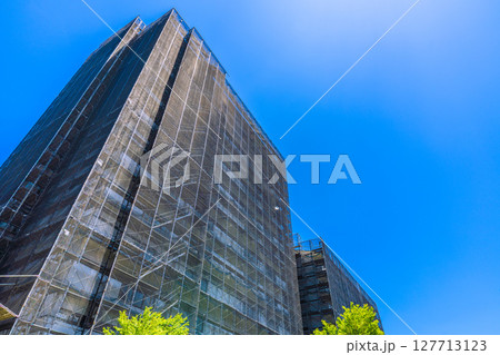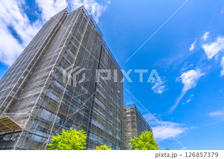 日本の横浜都市景観 マンションの補修や点検等、足場や防護ネットなどを望む…