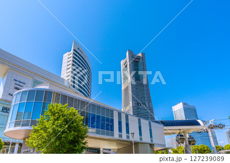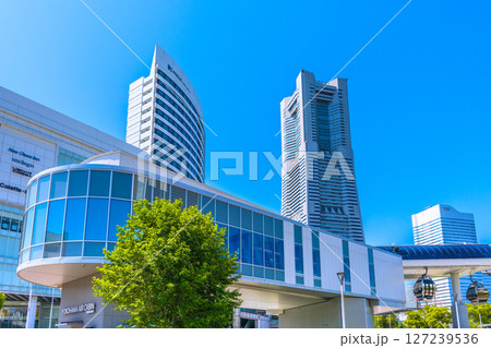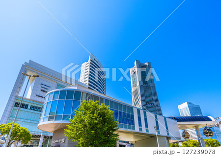 日本の東京都市景観 桜木町駅前。横浜市役所やヨコハマエアキャビンなどを望む