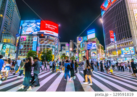 日本の東京都市景観8月外国人観光客らで賑わう夜の渋谷スクランブル交差点=3日、21時20分