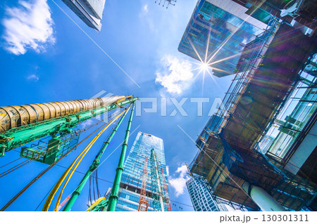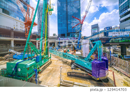 日本の東京都市景観8月19日。クローラークレーンやパイルドライバーなどの巨大重機がズラリ…=渋谷