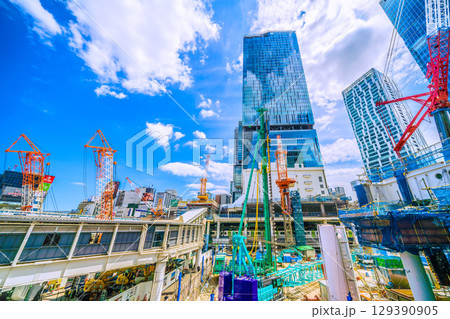 日本の東京都市景観8月8日。クローラークレーンやパイルドライバーなどの巨大重機がズラリ…新章へ=渋谷