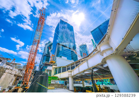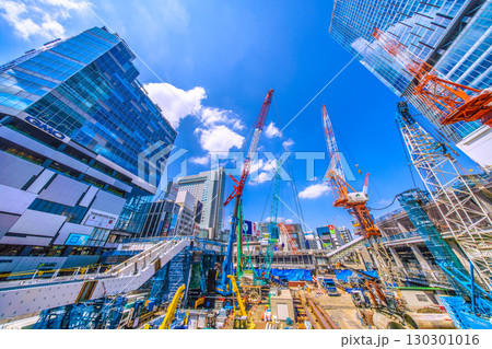 日本の東京都市景観8月8日。猛烈な暑さ…パイルドライバーなどの巨大重機がズラリ…。新章へ…=渋谷