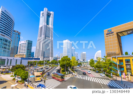 日本の横浜都市景観9月6日。桜木町駅 新南口やランドマークタワー、Hメッツ、横浜市役所、電車など…